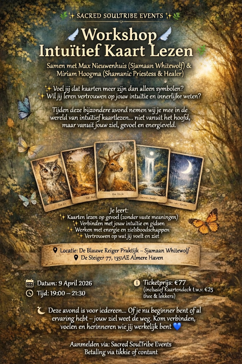 We hebben binnenkort een leuke workshop Intuïtief Kaart Lezen Donderdag 9 april 2026 bij de Praktijk van Sjamaan Whitewolf De Blauwe Reiger De Steiger 77, 1351 AE Almere Haven Doe jij ook mee ?